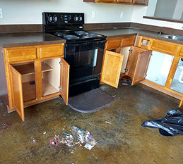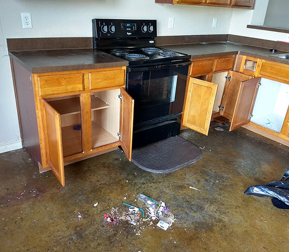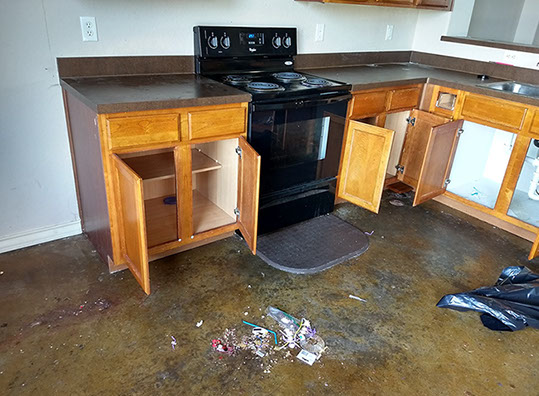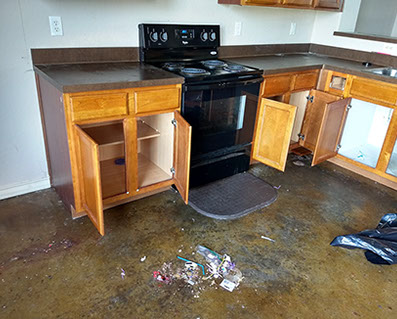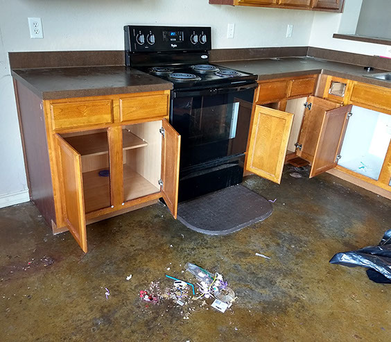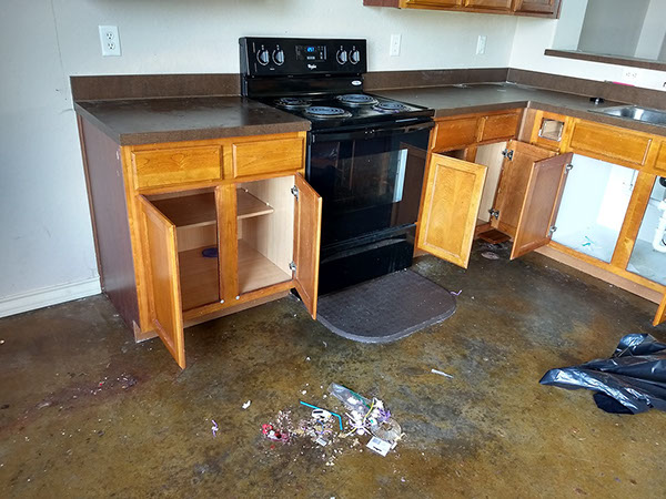 All collected trash, debris and cleaning materials are removed from the unit and disposed of on-site.